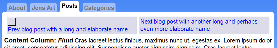 ≺table class = "nav"≻≺br /≻ ≺tr≻≺br /≻ ≺td≻≺a href = "/"≻Prev blog post with a long and elaborate name≺/a≻≺/td≻≺br /≻ ≺td≻≺a href = "/"≻Next blog post with another long and perhaps even more elaborate name≺/a≻≺/td≻≺br /≻ ≺/tr≻≺br /≻≺/table≻