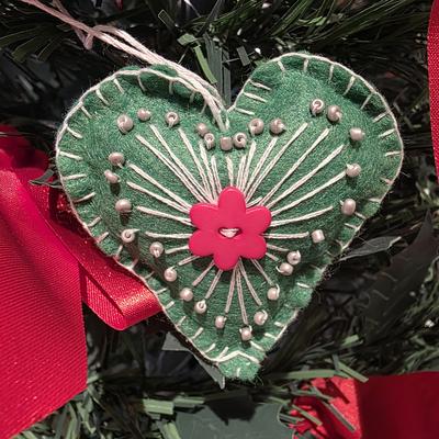 We got a Yule tree in the office. It is made of plastic, and it pops up from a flat box. It has all the decorations and lights, which is highly convenient. The tree is mounted in about three minutes. Under the tree, there are presents made by two coworkers, Rita and Erika. They like doing arts and crafts in their spare time. They set up an Advent calendar where we get packages on specific days. Today it was my turn to open my package. I got a felted green heart with a red flower button in the middle and pearls around the edge with threads arranged so that it looked like a firework! I also got chocolate candy.