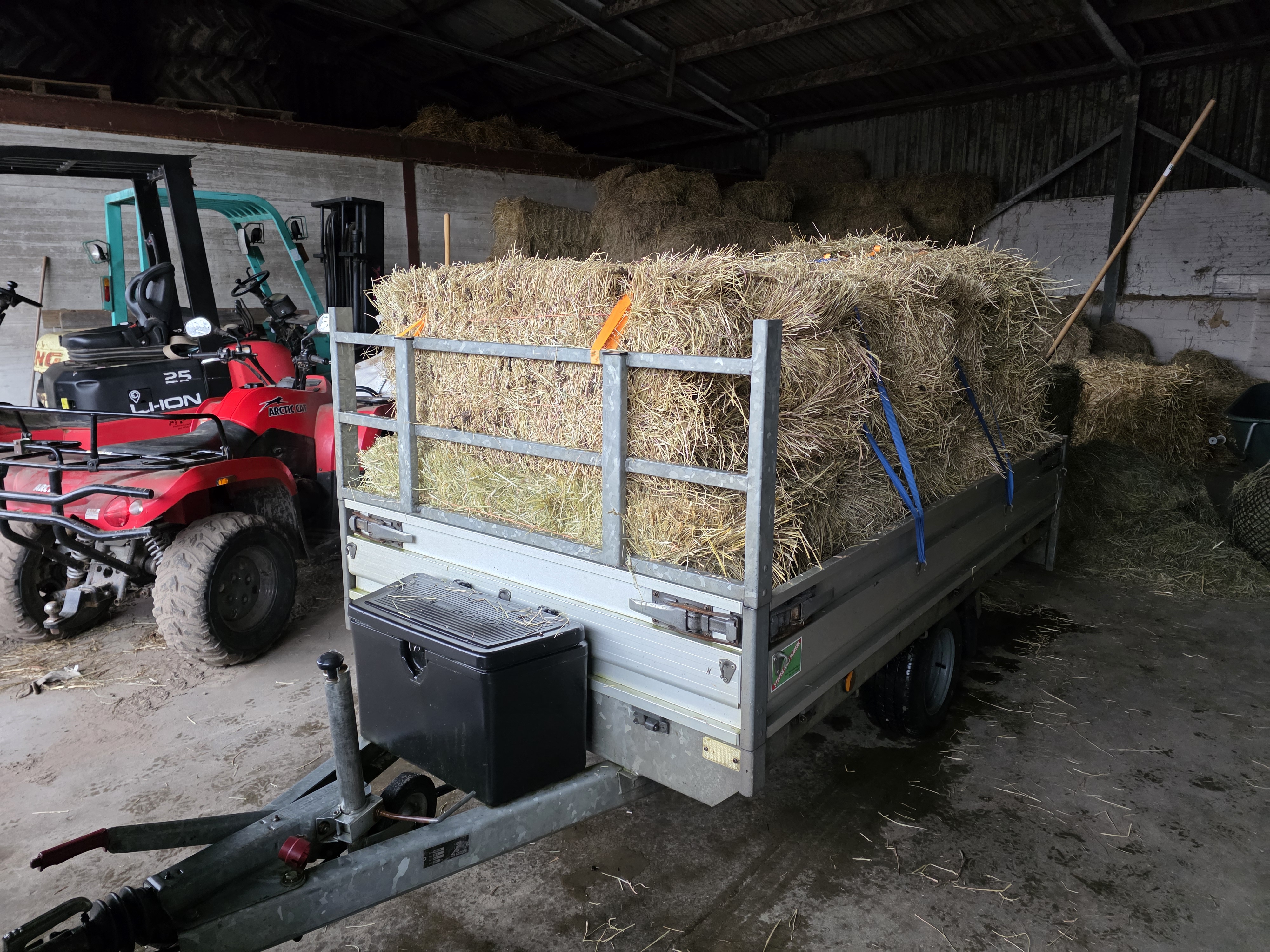 After the coffee, we drove home with the load, and we filled our temporary hay shed, now with light. The ropes around the bales were not as tight as they used to be. It was hard to keep them together. We use one ratchet band to repair one bale.