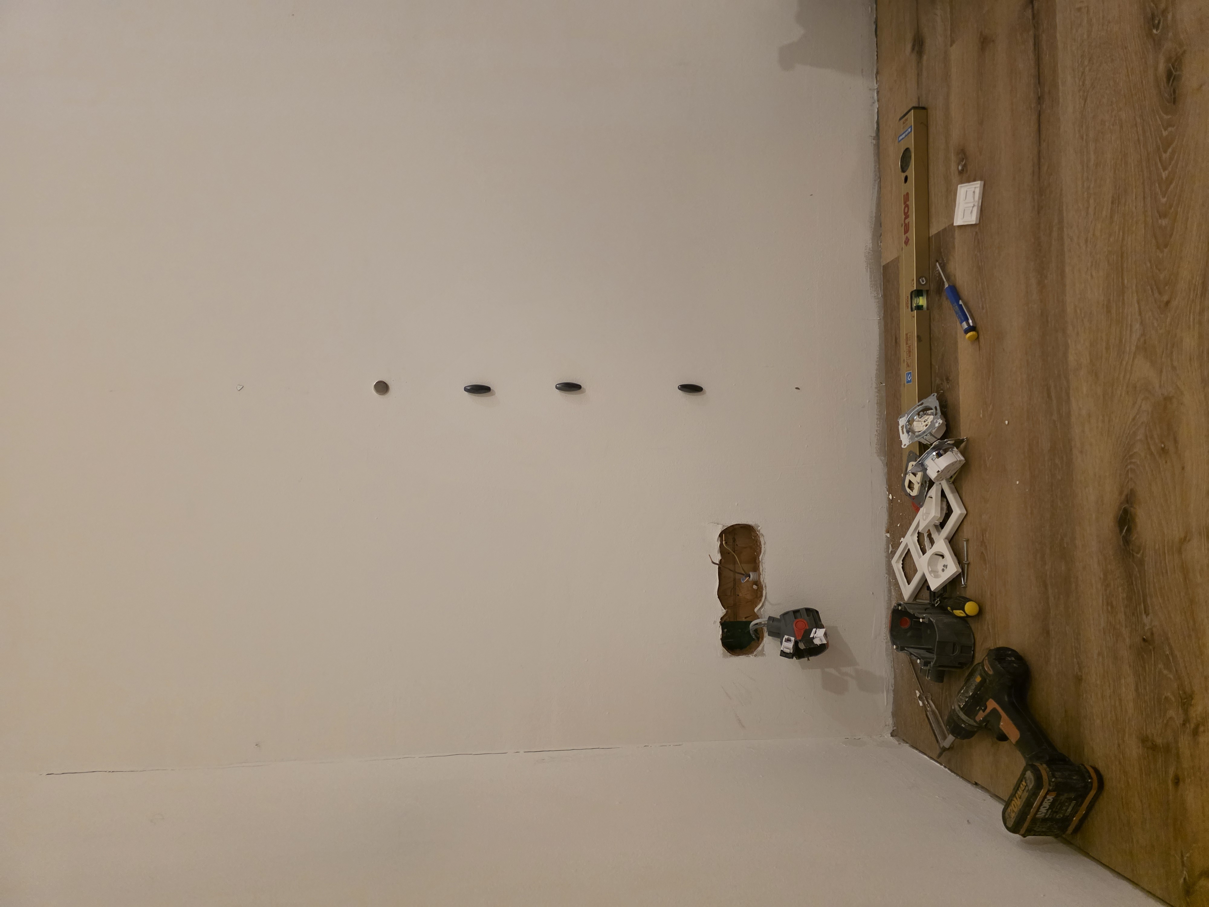 I brought a whole lot of tooling to the guest room. It was a great moment to use those tools to install the bathroom lamps on the first floor. We had the two fixtures lying around for more than a year. Until now I was not ready to install them, but now it was time. I got them installed.
