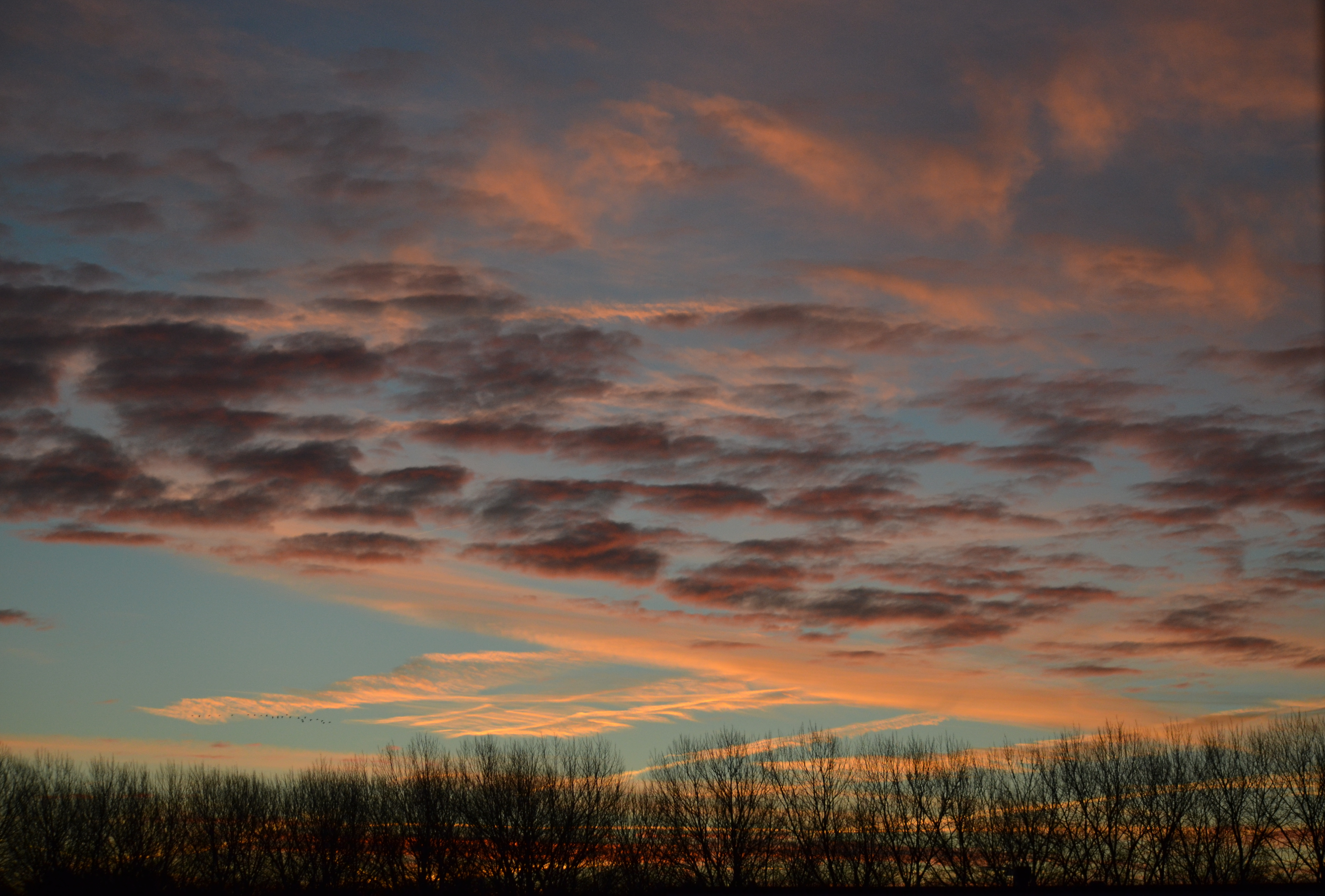 This was a special morning. Across the horizon, a regiment of leafless trees stands in silhouette, their branches like ink strokes from a confident calligrapher. They form a dark, delicate lace that anchors the scene while everything above them dissolves into color.
